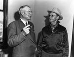 From a series of images from Eastland, Texas, the county seat of Eastland County, related to the expanding oil development. John Hart, left, former sheriff and later county judge, has one of the oil wells in the Bankline Owen pool on his land. Next to him stands A. M. Hearn, who also has a well on his land. Published in the morning edition, February 25, 1951.
