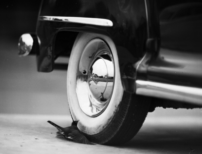 Image of a bird looking at a hubcap, the bird can be seen sitting on the grown looking up toward its reflection. Not even the flash from Star-Telegram Photographer Wilburn Davis' camera could deter this single-minded robin from admiring his reflection in the shiny hubcap of a car parked in the 200 block of Crestwood. The bird was known for coming around to stare at its reflection every time the vehicle's owner got it polished. Published in the morning edition, February 26, 1951.