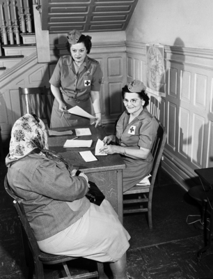 Image shows Mrs. Mary Ann Chance, left, seated, asking Red Cross aid from Mrs. D. Wheeler, standing and Mrs. Leona M. Smith, seated, in reception hall. Published in the Fort Worth Star-Telegram morning edition, March 4, 1951.