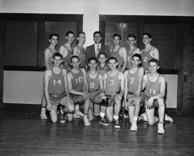Members of the William James team which won the junior high school Group A basketball title are, front row (left to right), Wyman Baker, Woody Woodman, I. B. Childs, Kenneth Lee, manager; Derald Hicks, David Dunnagan, Monk Owens; back row, Captain Harry Taylor, Elwyn Seay, Roy Dunkelberg, Coach Dan Rhome, Larry Lands, Ned Wilson and Jerry Hyde. Published in Fort Worth Star-Telegram evening edition February 26, 1951.