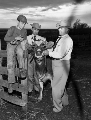 Image shows Spotty Belle, a Jersey cow owned by John Luther Byars. Shown beside the cow is Jerry Byars, John's brother, Dunkle and Hooser. Published in the Fort Worth Star-Telegram April 1951.