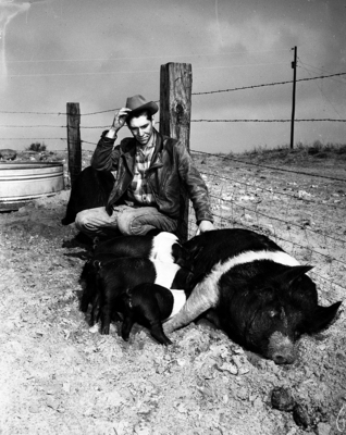 Image shows Charles Graf, Wilberger County 4-H youth, inspecting one of his registered Hampshire sows and her pigs. Last year his hog program brought him $ 1,200. Published in the Fort Worth Star-Telegram April 1951.
