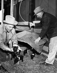 Image shows County agent F. T. Wendt, left, picking up a little Hampshire as Paul Graf, right, shows the canvas covered pig brooder. Published in the Fort Worth Star-Telegram April 1951.