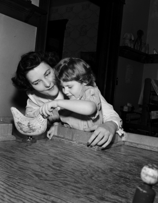 Image shows Mrs. Elizabeth Ford, left and Glenda Mae McDonald during play therapy at the Cerebral Palsy Treatment Center. Glenda Mae McDonald is learning to talk better and strengthen and co-ordinate hand and arm movements. Published in the Fort Worth Star-Telegram morning edition, March 9, 1951.