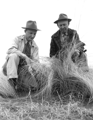 Image shows Bomer B. Harris, Soil Conversation Service (SCS) conversationist, left and Homer Johnston examining weeping love grass. They are shown crouched over the weeping love grass. The farmer uses the grass as a buffer against wind erosion. Published in the Fort Worth Star-Telegram morning edition, March 11, 1951.