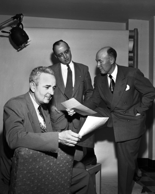 Plans for the kick off of the 1951 Red Cross campaign, to be held at Hotel Texas, are shown being reviewed by Yvon E. Juge, chairman of the special gifts and employees division, left; John L. Norton, county division chairman, center; and Murray Kyger, general chairman, right. Published in the evening edition, February 27, 1951.