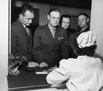When Lieutenant Don Ezell arrived from Korea early in the morning, he headed straight to his wife's bedside in Cleburne Memorial Hospital, accompanied by his three brothers. Shown standing in the hospital office, left to right, are Beekie Ezell, Lieutenant Don Ezell, Jeff Ezell, and Captain Dee Ezell. Published in the morning edition, February 28, 1951.