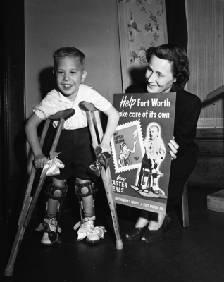 Young Ricky Williams is shown with his mother, Mrs. C. R. Williams. The boy's image was used on the Easter Seal Sale posters that were displayed in various parts of Fort Worth. Ricky who has cerebral palsy, received treatment at the Cerebral Palsy Treatment Center, that's work was financed by the seal sale. Published in the evening edition, March 2, 1951.
