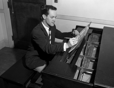 Image shows Robert Emile seated at a piano. He is writing some notes before his final concert. Published in the Fort Worth Star-Telegram morning edition, March 4, 1951.