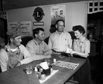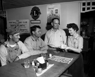Image shows two oil workers getting coffee from Mr. and Mrs. Stanley Mosteller cafe. From left to right, Robert Hill, Arp , wearing hat and Roy Herrin, Overton; Mr. Stanley Mosteller, and Mrs. Stanley Mosteller. They are shown seated at a table in cafe. Published in the Fort Worth Star-Telegram morning edition, March 11, 1951.