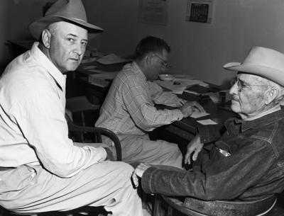 Image shows from left to right, H. W. Lenderman, W. W. Boswell and W. A. Smith. Boswell, center, Paint Rock real estate agent and abstractor closes land deal for H. W. Lenderman. He purchased the rights and three fourths of mineral rights on 161 acres from W. A. Smith Concho County ranchman. They are shown seated at table closing deal. Published in the Fort Worth Star-Telegram morning edition, March 11, 1951.