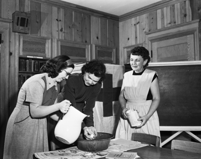 Image shows a demonstration of a Red Cross Home Nursing Course that was offered by the South Hi Mont Parent-Teacher Association. The class was taught by Mrs. Helen Reagan, right. On the left two of the courses students Mrs. C. R. Wilkinson, and Mrs. C. A. Childers, are shown learning the technique for cleanliness when there is no running water. Published in the evening edition, March 2, 1951.