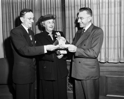 A round of smiles was in order as the last deposits went to the bank to bring the 1951 March of Dimes campaign total to $98,018.81. Shown smiling in the moment are left to right, T. E. Graham, treasurer of the Tarrant County Chapter of the National Foundation of Infantile Paralysis, left; Mrs. James Leonard, executive secretary, center; and John H. Repper, campaign treasurer. Published in the evening edition, February 27, 1951.