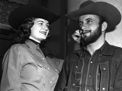 June Prichard, left, 19-year-old junior from Seymour, was chosen as Texas Christian University's Ranch week queen. She is shown standing next to R. F. "Puck" Sloan, a Fort Worth Junior who was named "Ranch Week" foreman. Published in the evening edition, February 28, 1951.