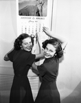 Lenda Lue Cook, left, and Glenda Sue Cook, right, twin daughters of Mr. and Mrs. Grady W. Cook, of 2103 Belle, to celebrate their 15th birthday at the end of the month. The girls were born on a Leap Year, they planned to celebrate their birthday that year on the 1st of March, though they can be seen jokingly adding an additional day to February on their calendar. They were both students at J. P. Elder Junior High. Published in the evening edition, February 28, 1951.
