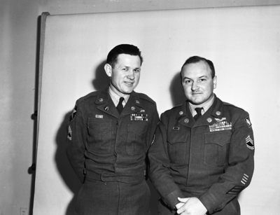 Sergeant First Class Leon N. McDuffie, left, and Sergeant Llewellyn M. Chilson, were assigned from Fort Hood as Reserve Officers' Training Corps (ROTC) instructors for Polytechnic and Paschal High Schools, respectively by Major V. V. Laughlin, professor of military science and tactics. Published in the evening edition, March 2, 1951.