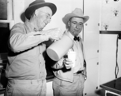 Image shows I. S. Echols, left, pouring goat milk for Cooper. They are shown to be in a kitchen. Published in the Fort Worth Star-Telegram April 1951.