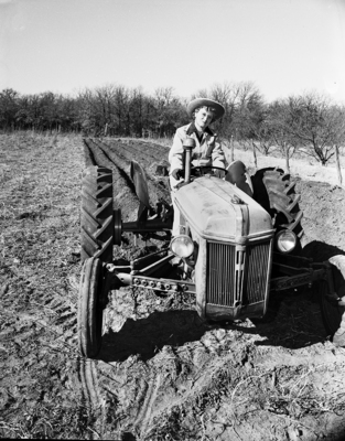 Image from a series on Denton County Home Demonstration Agents, published in the Fort Worth Star-Telegram's Ranch and Farm News. The Image shows Mrs. Lucius Cox, a member of the Denton County home demonstration council, sitting on a tractor, doing farm work. Published in March, 1951.