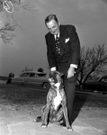 Image shows C. T. McLaughlin and his Boxer dog, Firpo. They are shown to be outside with a car in the background.