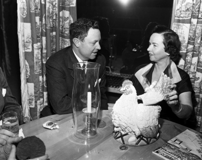 Image shows Jay Taylor, left and Mrs. Edith McKanna at a table conversating. Mrs. Edith McKanna appears to be touching a chicken decoration on the table.