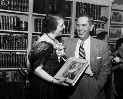 Image shows Mrs. Georgia Neese Clark, left and Houston Hart standing in front of a book shelf. Mrs Clark is shown conversating with Hart while holding a book. There is two unidentified women to the right.