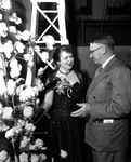 Image shows Mrs. Clark talking with Synder's Mayor, Forrest G. Sears. She learns some of Scurry County's wealth - oil and cotton. They are shown to be behind a stage. There is a cotton plant to the left of Mrs. Clark. Published in the Fort Worth Star-Telegram morning edition, March 4, 1951.