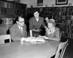 Image shows John Kemmerer, vice chairman of the Fort Worth Committee in charge of Public School Week, making a visit to Paschal to make arrangements for the reception of visitors. Barbara Duese, center, Paschal junior, shows him and Mrs, Jon Lambert, P-TA City council president, what visitors will find in the library. The get- acquainted week is under sponsorship of the Fort Worth Chamber of Commerce American Opportunity Committee. The goal is 40,000 for visitation. Published in the Fort Worth Star-Telegram morning edition, March 4, 1951.
