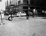 Image shows a shot of W. 7th street. A deep low pressure are in Central Kansas reached into Fort Worth with 20 miles an hour wind and the peak reaching 48 mile winds. The image shows pedestrians holding their hats. An unidentified woman and girl on left are holding their hats. Published in the Fort Worth Star-Telegram morning edition, March 3, 1951.