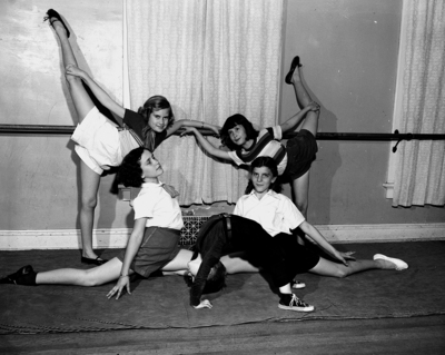 Image shows five children in acrobatic pose at a la Carolyn Lee. From left to right back, Linda Turley and Norma Purvis; left center, Melinda Milrany; right center, Wynelle Emery; and front, Victor Barry Caster. Published in the Fort Worth Star-Telegram morning edition, March 11, 1951.