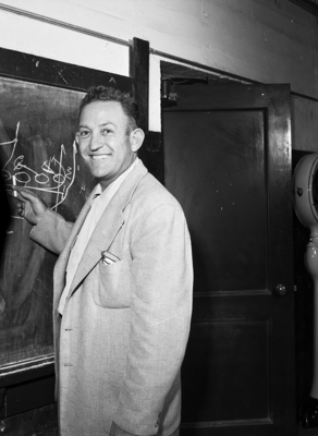 Pictured here is Oklahoma Aggie Coach J. B. (Ears) Whitworth, who shares top staff positions in two-day clinic with Texas Christian University (TCU) Coach Dutch Meyer.