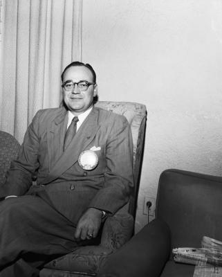 Image shows David W. Fishley sitting in a chair looking toward the camera. He has a button pinned to his suit that reads "Optometrist international." Published in the morning edition, March 3, 1951.