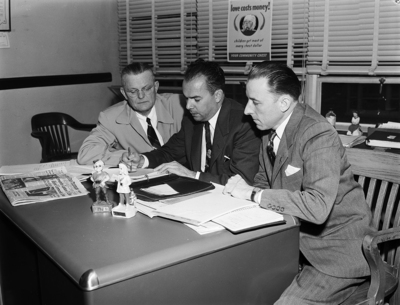 Image shows three Community Chest executives making plans for a regional meeting here in April. Left to right, Andy Nilson, Fort Worth chest director, Olin LeBaron, Galveston County executive director and president of the regional group and Leonard Swoverland, Tulsa Chest Director. Published in the Fort Worth Star-Telegram morning edition, March 4, 1951.