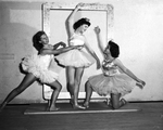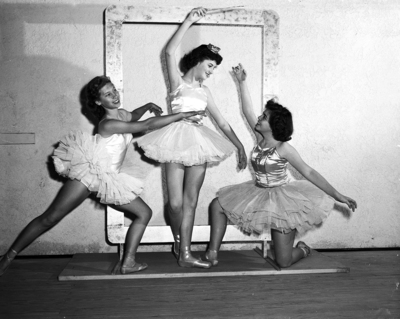 Three ballerina students studying classical dancing under Dorothy Coulter Edwards. From left to right, Gwendolyn BaumGardner, Joan Allen and Helen Samaras. They are shown posed. Published in the Fort Worth Star-Telegram morning edition, March 11, 1951.