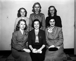 Image shows a group of six University of Texas members of Mu Phi Epsilon. They attended a convention at Texas Christian University (TCU). From left to right, front row, June Stokes, Houston, Martha Keller, Dublin and Lorene Michalopulos, San Angelo; back row, left to right, Laura Mae Cullen, Austin, Bayla Sheinberg, Fort Worth and Barbara Oster, Dallas. Published in the Fort Worth Star-Telegram morning edition, March 6, 1951.