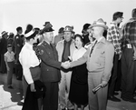 Image shows Fort Worth visitors at ceremonies on Whitney Dam when a link of State Highway 22 across the top of the dam was opened. Were greeted by Staff Sergeant Fred T. Basham, former mayor of Whitney, Air Force and stationed at Carswell Air Base. He is shown welcoming visitors. Left to right, Mrs. F. W. Frank, Sergeant Basham, F. W. Frank, Mrs. C. S. Willingham and C. S. Willingham. Published in the Fort Worth Star-Telegram evening edition, March 5, 1951.