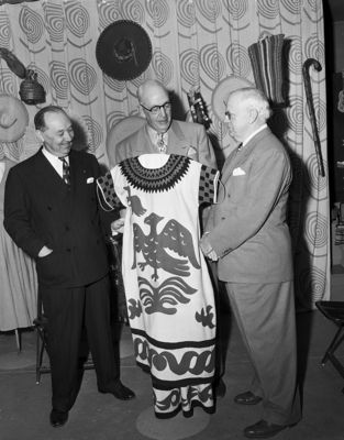 Image shows Neville Penrose, Fort Worth, left, chairman of the Texas Good Neighbor Commission and Mayor Deen, right, inspecting a handmade Mexican costume held by J. Lee Johnson Jr., chairman of the Fort Worth Children's Museum board. They are shown to be inspecting a Mexican exhibit at the museum. Published in the Fort Worth Star-Telegram evening edition, March 5, 1951.