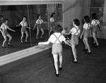 Image shows four tap dancers at Frances Burgess' school. Left to right, Joyce Wakefield, Alice Mays, Susan Jackson and Sue Sullivan. They are shown to be tap dancing in front of a mirror. Published in the Fort Worth Star-Telegram morning edition, March 11, 1951.