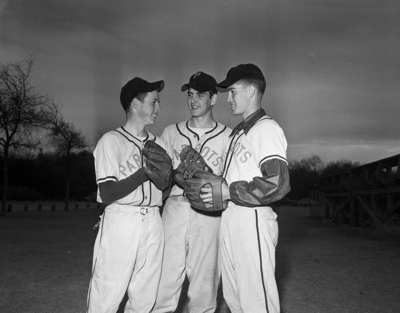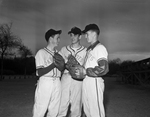 Three Poly baseball lettermen talk things over during practice at Sycamore Park. They are, left to right, Clyde Dodson, second baseman; Roger Looney, third baseman, and Ken Withers, pitcher.