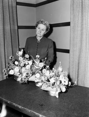 Image shows Mrs. Alfred McKnight standing beside table with flower arrangement. Published in the Fort Worth Star-Telegram morning edition, March 7, 1951.