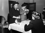 Image shows Mrs. Charles G. Eidson, left, Waco, council state president and Mrs. Earl Sanders, right, president of the Brownwood council registering for the Texas Council of Church Women's conference. Mrs. Ray McKinley, seated, 3801 Pershing is shown helping . Published in the Fort Worth Star-Telegram evening edition, March 7, 1951.