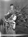 Image shows Jimmy Dyer, 6, left, and Welda Brack, 9, right, collecting branches from a plum tree. The plum tree appears to have blossoms on them. Jimmy Dyer is shown to be seated on a ladder. Published in the Fort Worth Star-Telegram morning edition, March 7, 1951.