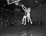 Texas Christian University Frogs' Harvey Fromme (jersey no.24) drives in for layup but A&M's John DeWitt stretches to knock ball away. Published in Fort Worth Star-Telegram evening edition March 7, 1951.