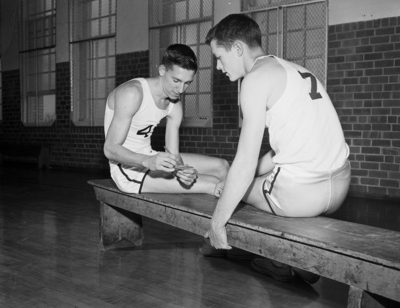 Two North Side starters, George Dato Jr., left, and Chester Slawson, talk over strategy to be used against Dallas Sunset in state City Conference cage meet. Published in Fort Worth Star-Telegram evening edition March 9, 1951.