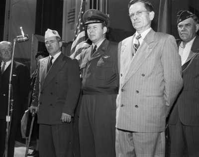 From left, Jack Davis, commander of Disabled American Veterans; Colonel Calvin W. Fite, Jr., commander of Carswell Air Force Base's 7th Air Base Group; and William R. Bagley, disabled by cruel treatment as Japanese war prisoner, participate in Fort Worth's Disabled Vets Day