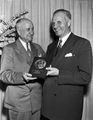 Amon Carter, left, shown receiving honorary life membership in the Fort Worth YMCA, from Luther Youngdahl.