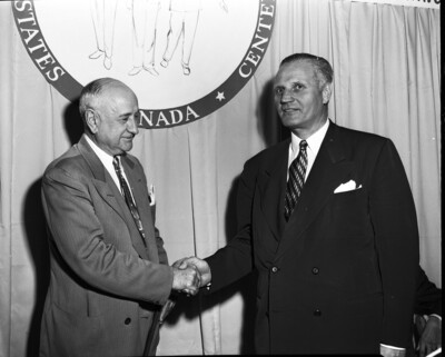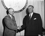 Amon Carter, left, receives congradulations from Minnesota Gov. Luther W. Youngdahl, right.