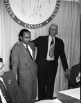 Victor G. M. Pavamani, left, former member of the YMCA board in Calcutta, India, spoke to the group on how the YMCA's world service program was helping his country. During the ceremony, Amon Carter received an honorary life membership in the Fort Worth YMCA.