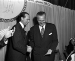 Luther Youngdahl and Stuart Lydick are seen shaking hands at a YMCA event. Both men are wearing suits and ties.