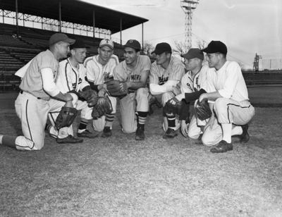 These seven players, among 64 "hopefuls" taking part in Brooklyn Dodger tryout camp at La Grave Field, represent seven states. Left to right are Outfielder AL Kloeckner of Burlington, Colorado; Infielder Richard Johnson of Kansas City, Missouri; Outfielder J. T. Jaynes of Conway, Arkansas; Pitcher George David of Detroit, Michigan; Pitcher Clifford Ohr of Truscott, Texas, Infielder Morris Mack of Aberdeen, South Dakota; and Infielder Dick Vizkozki of Taylorville, Illinois. Published in Fort Worth Star-Telegram morning edition March 28, 1951.