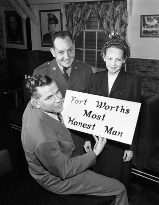 Image shows Roy H. Pearson, left, holding a sign that says, Fort Worth's Most Honest Man. He was proclaimed this title by airmen at Carswell Air Force Base. Pearson found and returned a billfold containing $150 to Tech Sergeant Ralph R. Dillard, center, wearing military uniform. Mrs. Pearson is at right. Published in the Fort Worth Star-Telegram morning edition, March 8, 1951.